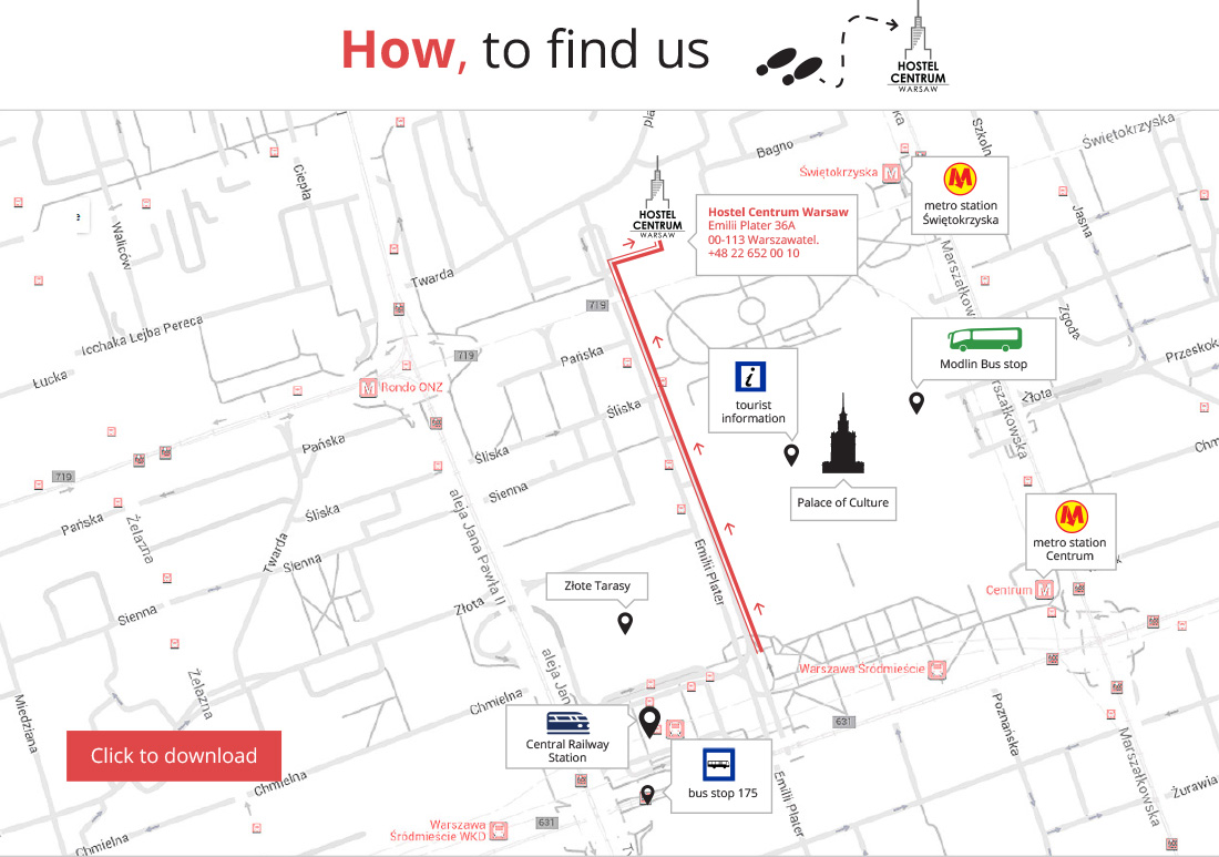 Take a Modlin Bus. It's the easiest, cheapest and most comfortable way of getting to the city centre. The bus will drop you off in the car park of the Palace of Science and Culture, almost on our doorstep. Look around, locate the small park on the side of the Palace. Go in a bit and when you see a round fountain cross the street (Świętokrzyska Street).